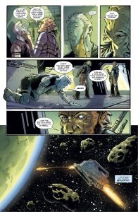 The strongest element is the dynamic between Ishmael and Que-Keg. Their contrasting worldviews create natural conflict that makes scenes crackle without needing explosions to carry weight. The scene where Que-Keg casually mentions betting Ishmael as a slave, then dismisses his shock, lands perfectly; it tells us everything about her survival mindset in three panels. The art effectively conveys emotional states through facial expressions and body language, reducing reliance on heavy narration. The world-building, while exposition-heavy, establishes a coherent galactic economy with clear stakes for each faction. The pacing never stalls despite juggling flashbacks and present-day action.