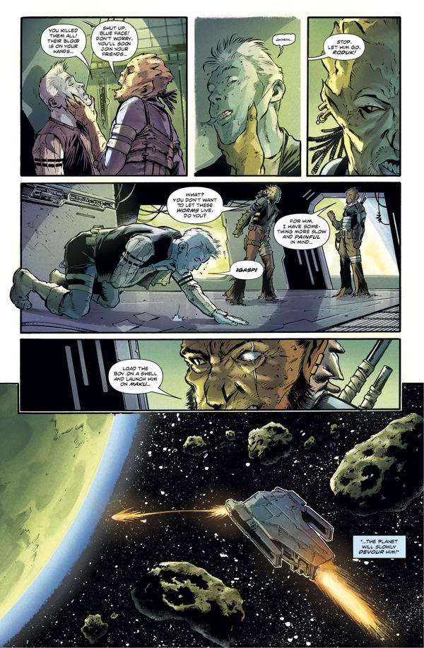 The comic opens with a mysterious traveler reflecting on centuries spent chasing space-time singularities, but this opening quickly pivots to a scene of brutal violence. A blue-skinned humanoid is tortured and executed by a faction leader named Roduk, while his young companion is cast onto the planet Maku to slowly die from silicon poisoning. We then cut backward to meet our main character, Ishmael, as a young man leaving his peaceful homeworld of Kalua to seek adventure among the stars. His tearful departure reveals a classic tension: familial love versus personal ambition.