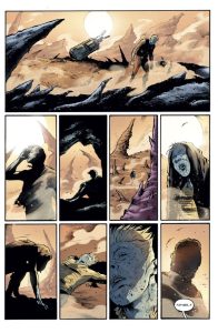Ishmael reads as genuinely conflicted and his naivety feels earned rather than contrived. Que-Keg is the stronger character; her cynicism has weight because we see the world that shaped it, and her moments of dark humor ring true. Their dynamic works because they want fundamentally different things. The issue struggles slightly with secondary characters, particularly Roduk and JidO, who function more as plot devices than people. That said, the relationship between Ishmael and Que-Keg carries enough emotional authenticity to sustain reader investment.