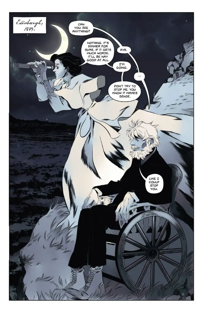 We begin with a moonlit scene in Edinburgh, 1249. Eliza and her father urgently scan the isolated island of the nearby lighthouse, looking for signs of life as the lighthouse appears to be rapidly dimming. Knowing that a darkened lighthouse means catastrophe for passing ships, Eliza decides to a small boat out to the island to investigate.