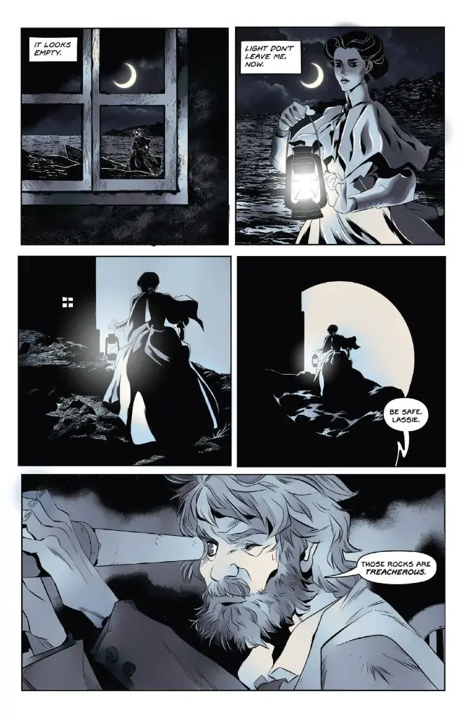 AT LAST THE LIGHT (ONE-SHOT), from Blue Fox Comics soon on Kickstarter, follows a young woman determined to provide aid to a lighthouse keeper when the light begins to fade. What she finds is darkness a simple flame cannot dispel.