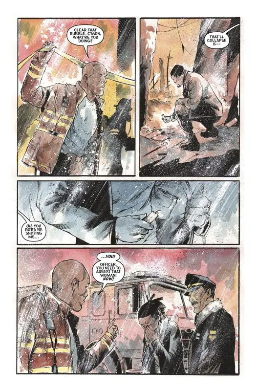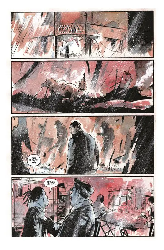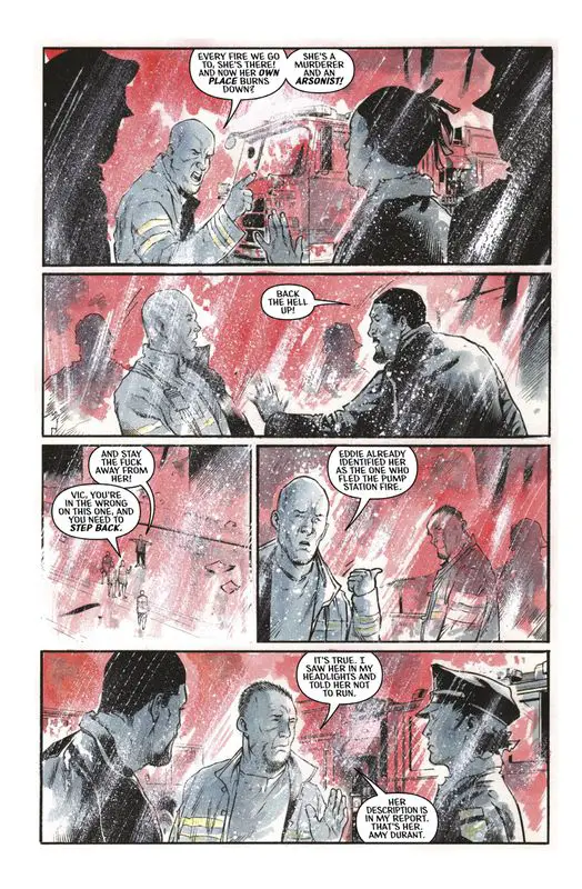 Vic wakes up in an underground cavern, witnessing human sacrifices to feed the Fire Man. He sees acolytes casting themselves into the flames to keep the Fire Man fed. Meanwhile, Amy is brought to the cavern, where the cult offers her a deal: stop opposing them, and they’ll let her communicate with her dead family. Amy refuses. Vic, witnessing the cult’s atrocities, rescues Amy, and they escape. The issue ends with them making their way up to the surface in the middle of a cemetery, where they encounter a woman who claims she knows what’s going on and intends to take the Fire Man down.