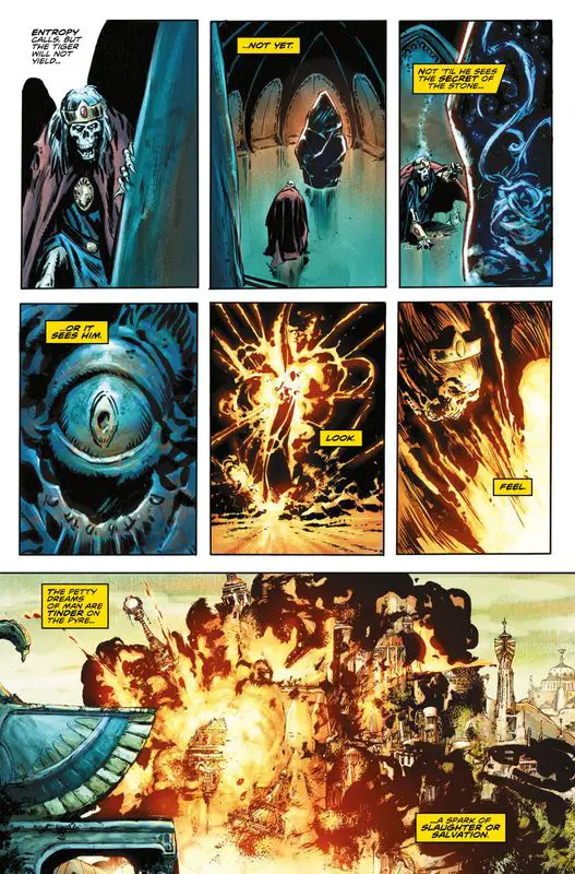 In Conan the Barbarian #10, we catch up with King Kull as he’s having a fever dream. In his vision, he sees himself surrounded by sentient representations of a lion and a tiger, guiding him towards his path. Led through the dense jungle and up on the cliff toop, he spots his home of Atlantis. The center of the city is dominated by a large black stone obelisk, with all the people around it turned into undead zombie-like creatures, synonymous with the power of the Black Stone. Approaching the pillar, he attempts to reach it, either to gain its power or stop it. At the last moment, the obelisk explodes, wiping out the city of Atlantis. Suddenly, King Kull wakes up, back in his mind and senses. His advisers explain what happened, revealing that Conan and Brule were accused of attempting to assassinate him. Kull, realizing his fault, arranges for their release, believing his dream to be a prophecy. He decides to go back to Atlantis, either to confront and stop something or prevent a terrible event. Conan and Brule agree to accompany him.
