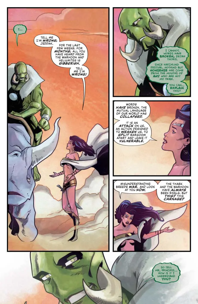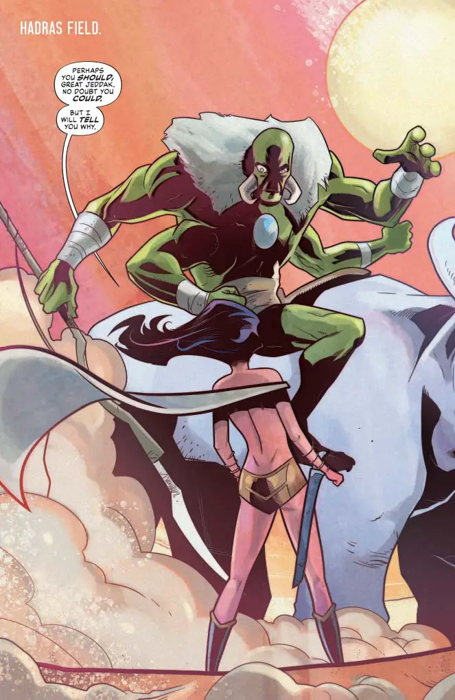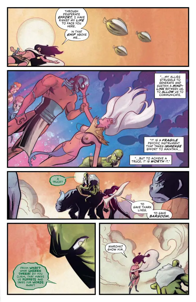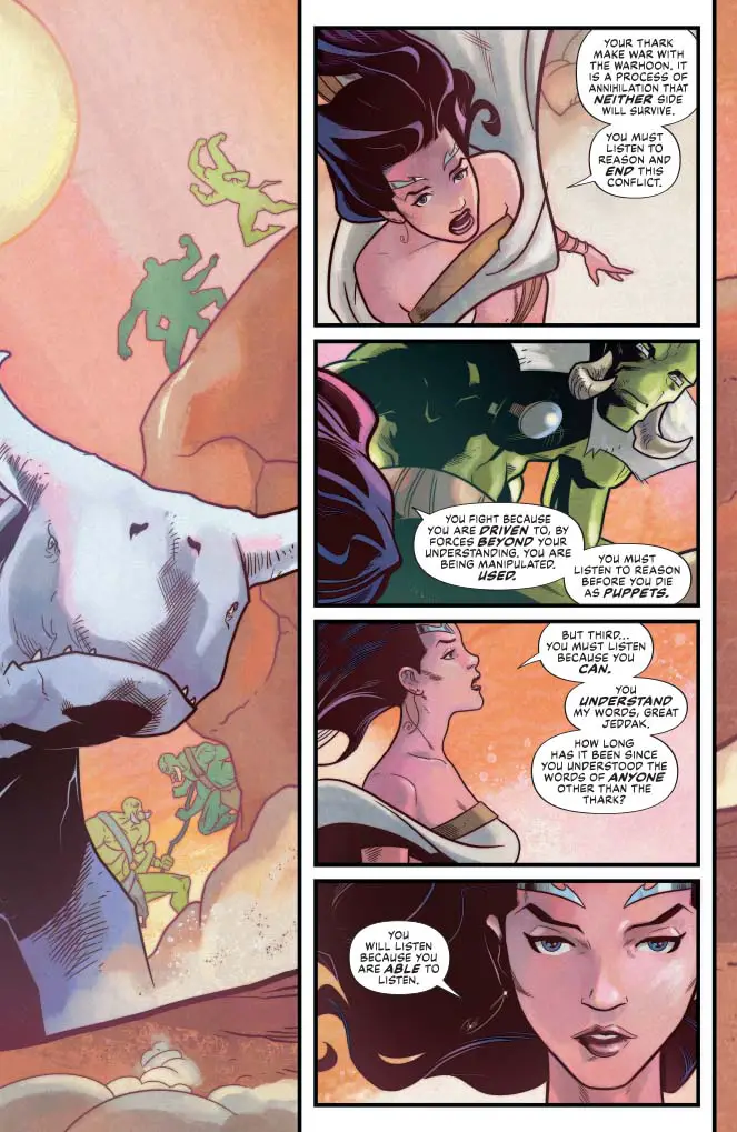 In this exclusive preview of DEJAH THORIS (VOL. 3) #11, available from Dynamite Comics on March 24th, 2021, Dejah Thoris must stop the war and created a united front to prevent the planet’s destruction by the manipulative Longborn.