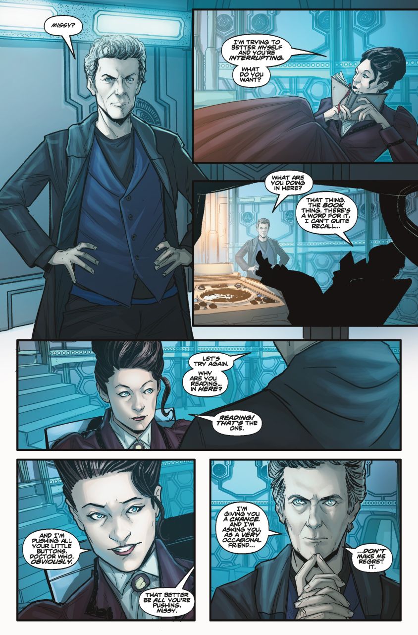 In this exclusive preview of DOCTOR WHO: MISSY #2, available from Titan Comics on May 12th, 2021, Missy’s ruse as a future Doctor is partially successful, but it takes companion, River Song, to earn the Master’s trust.