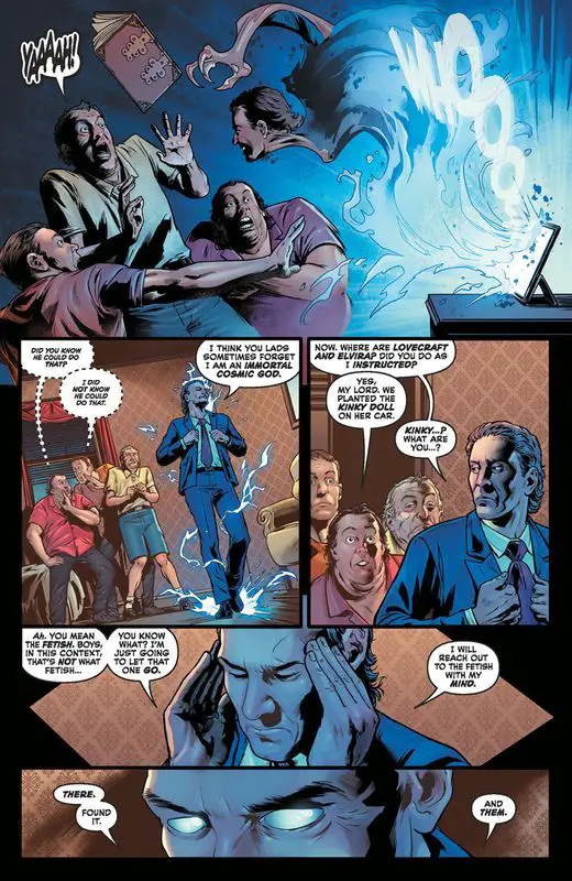In the latest installment, the story kicks off with three acolytes of Nyarlathotep realizing the Necronomicon they acquired is a counterfeit. Determined to locate the genuine article, Nyarlathotep directs them to track Elvira and H.P. Meanwhile, Elvira and H.P. navigate Grendel’s booby-trapped home in search of the book. They confront Grendel, who has prepared for their arrival by summoning night gaunts from the Dreamland. Despite their capture, H.P. strikes a deal with Grendel to use the book against Nyarlathotep. However, chaos ensues as Nyarlathotep and his acolytes breach Grendel’s home, leading to a climactic showdown.