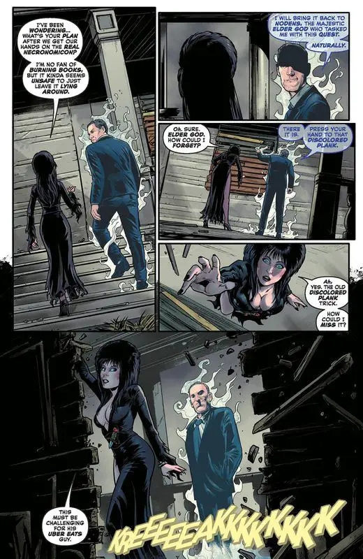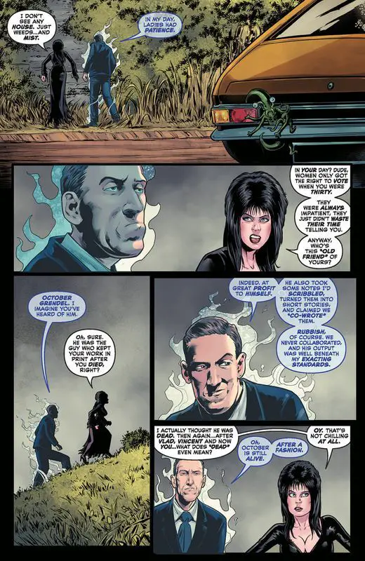 In the previous issue, Elvira and H.P. Lovecraft ventured to Arkham University to retrieve the supposed Necronomicon. Upon arrival, they encountered a deceitful librarian who sought to use the book for nefarious purposes. However, they discovered that the book was a fake, leading them to realize that H.P.’s old acquaintance, October Grendel, likely possessed the real one.