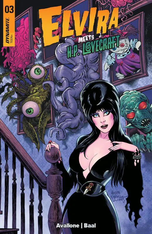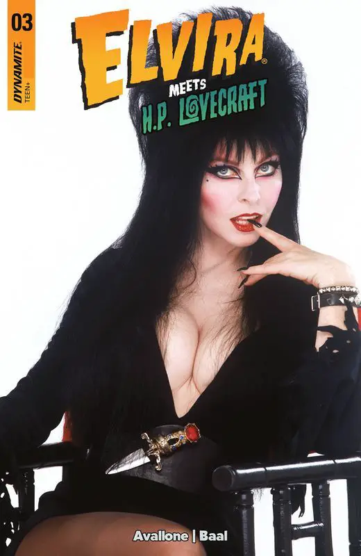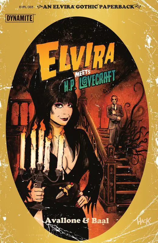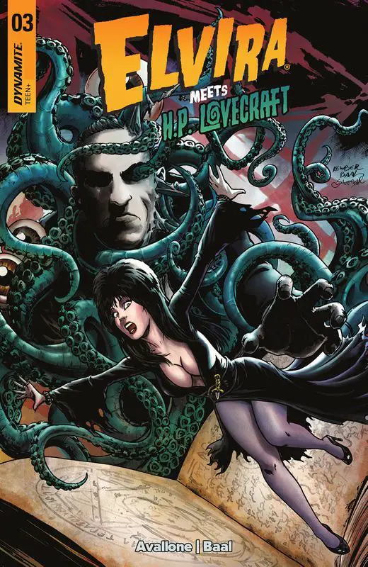 ELVIRA MEETS H.P. LOVECRAFT #3, by Dynamite Comics on 4/17/24, sends H.P. and Elvira to the home of October Grendel to retrieve the real Necronomicon and send Nyarlathotep packing.