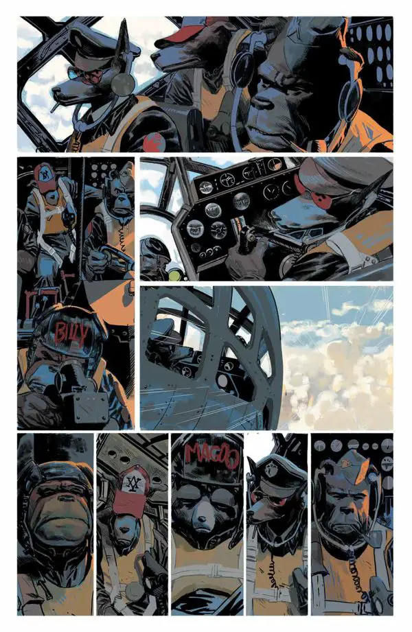 Daniel Acuña’s art and colors are absolutely phenomenal here. The gritty, almost desaturated palette perfectly captures the despair and grime of war. Every panel feels heavy, from the pilots’ grim expressions to the bombed-out landscapes. The anthropomorphic character designs are distinctive and expressive, adding a unique visual flair without detracting from the seriousness of the subject matter. The action sequences are dynamic and chaotic, especially the final moments of the issue.