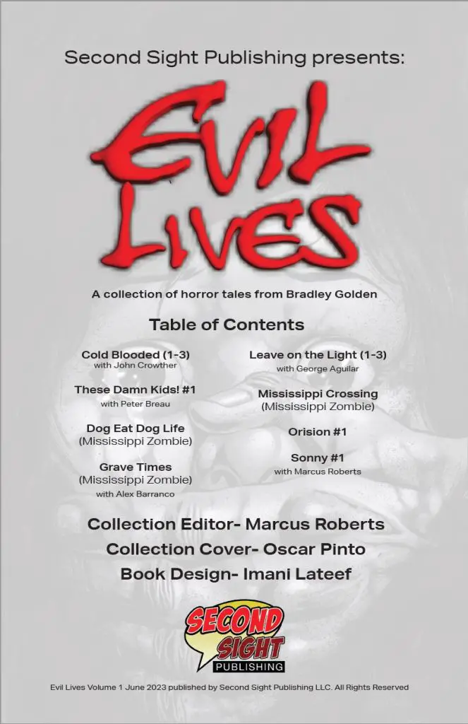 EVIL LIVES (OMNIBUS), from Second Sight Publishing, brings together the best mini-series and one-shots from Second Sight’s catalog of horrific creations.