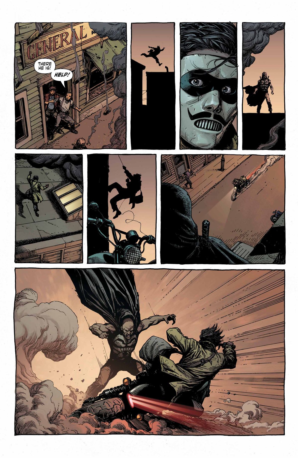 Geiger and Nate stake out the town for a few days until the bandit strikes again. Geiger jumps the bandit, but he gets away on a motorcycle. Geiger and Nate give chase on their motorcycles, leading to crashes, a foot race on top of a speeding train, and eventually, to the bandit’s wagon.