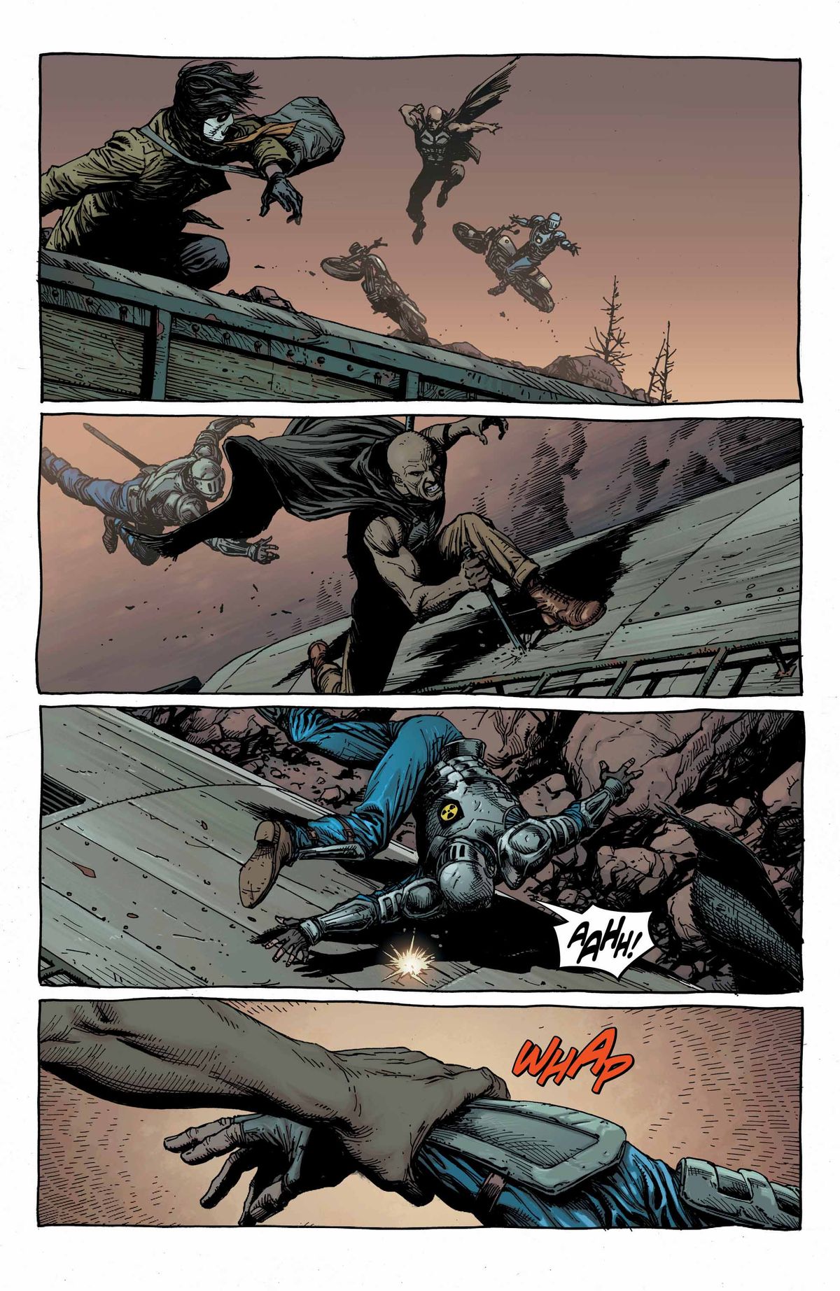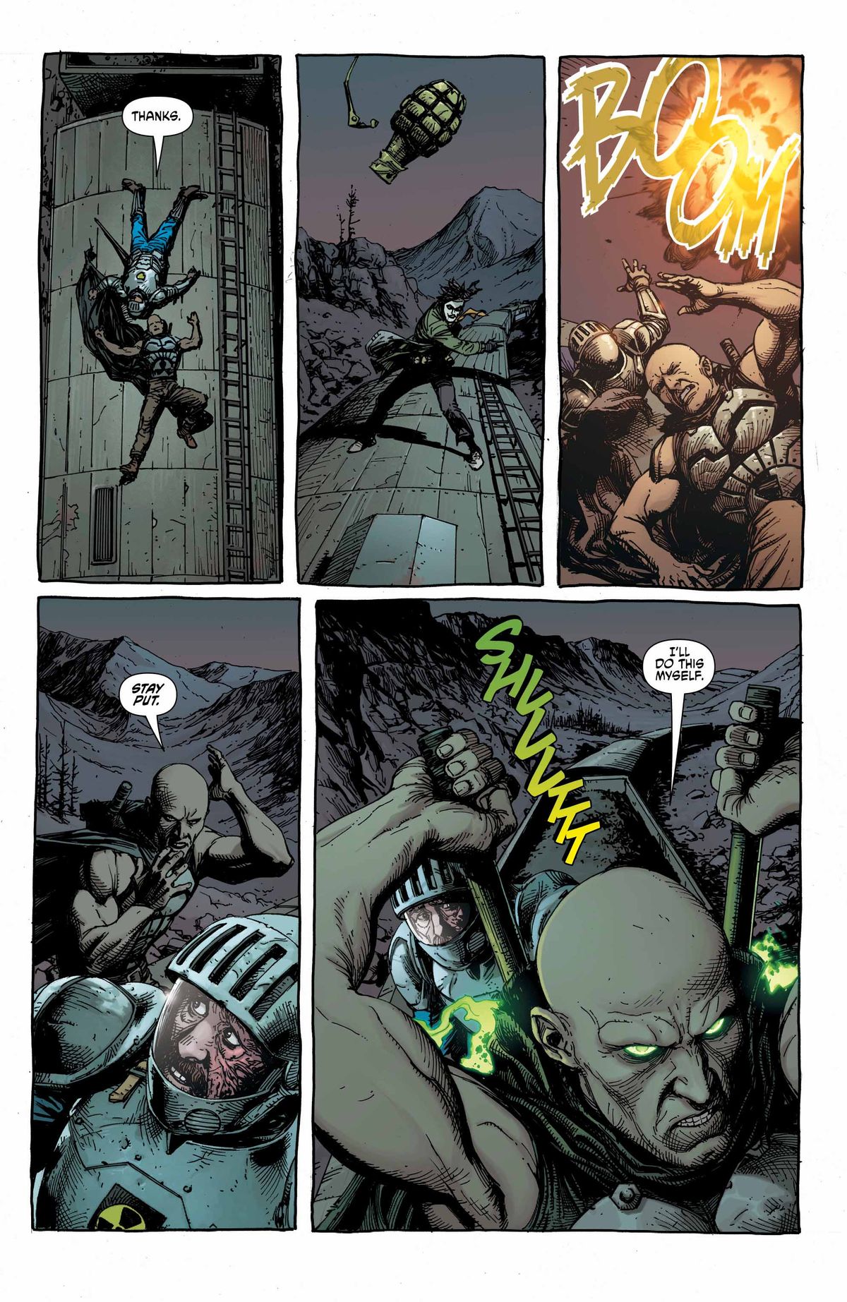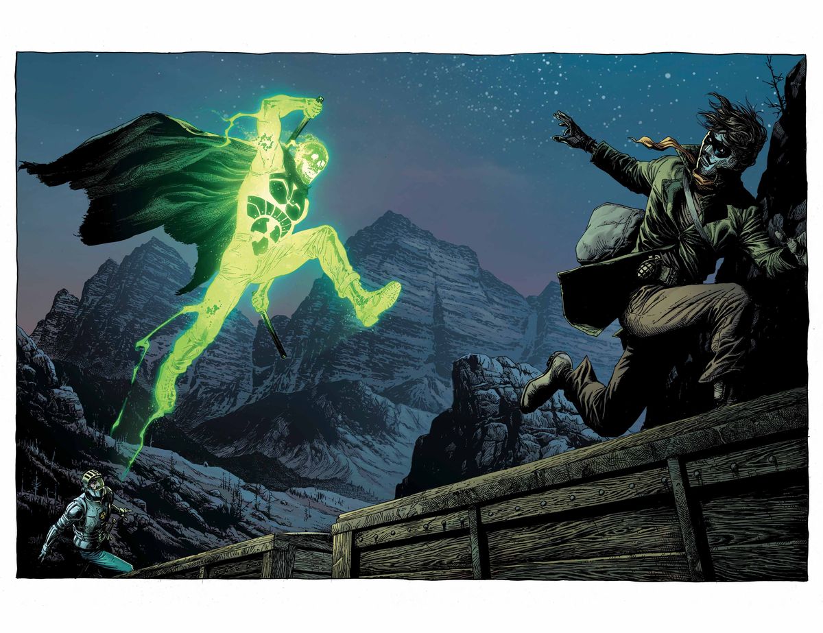 Gary Frank and Brad Anderson’s artwork is practically exquisite. Frank’s pencils/inks are detailed to the Nth degree, and his panel compositions are positively cinematic. Special kudos to Brad Anderson for making dusty earth tones pop and achieving eye-catching glow effects that light up the surroundings when Geiger activates his powers.