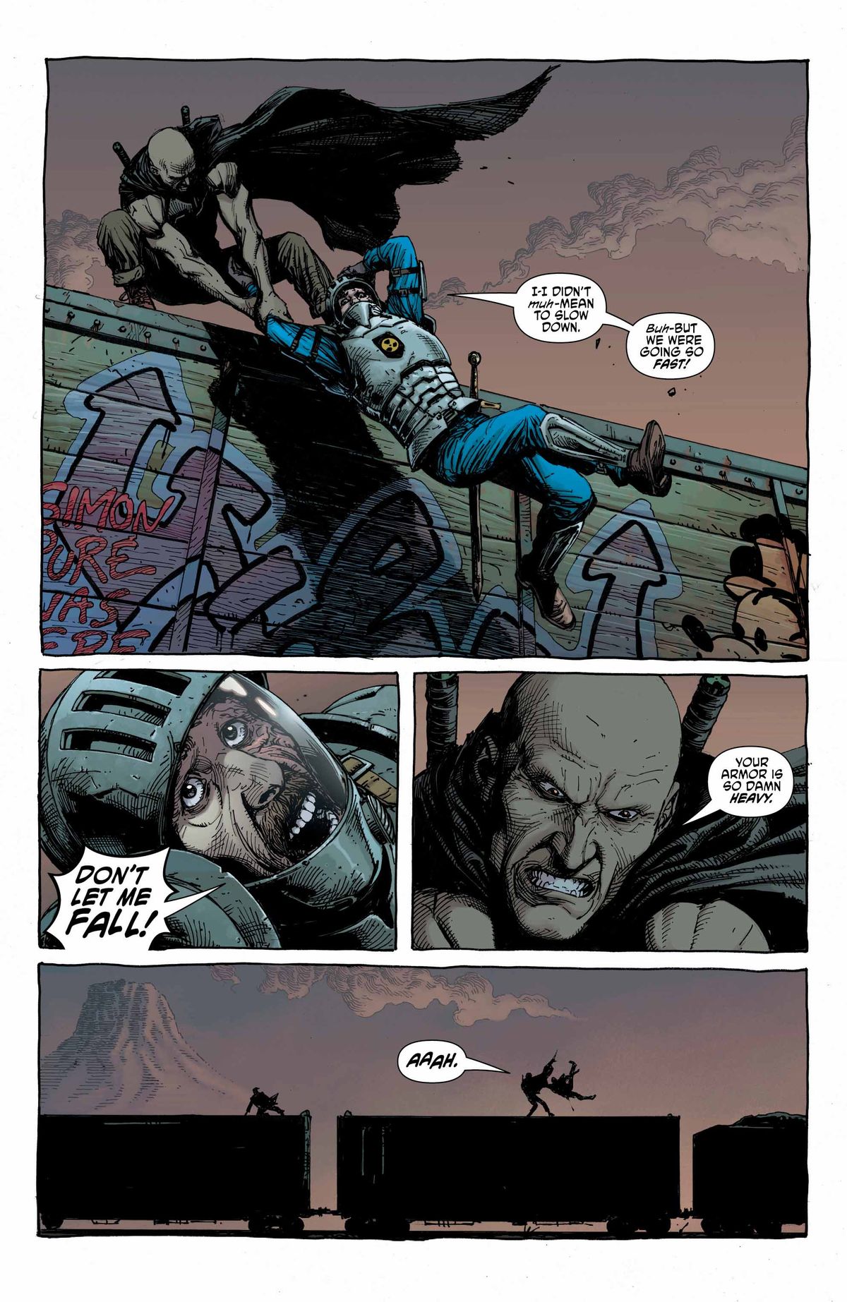 In GEIGER #2, we catch up with Geiger and Nate wandering their way to the next town to find information about a supposedly cured Glowing Man. During their long trek, Nate happens upon a wild boar and charges to catch it for fresh meat. The chase leads to a cubby on a hillside, but Nate pauses when he sees the boar has a mate and piglets. Geiger intends to slaughter the bunch, but a moment of mercy weighs on him, and he only kills the male adult.