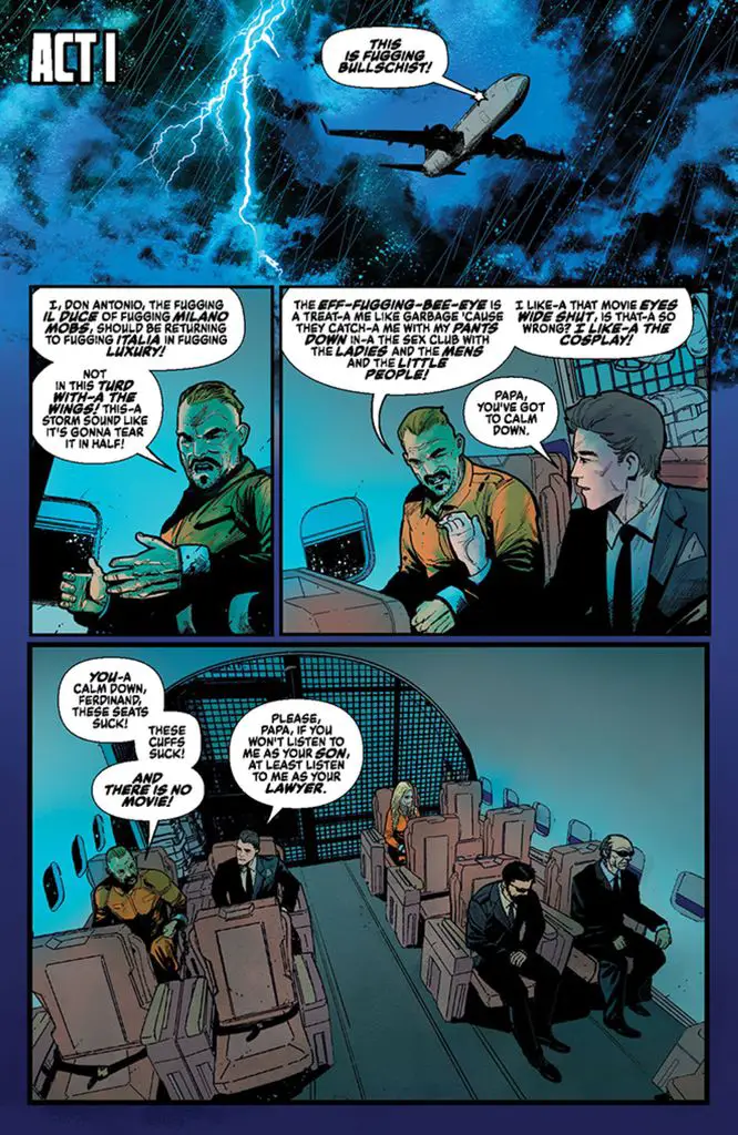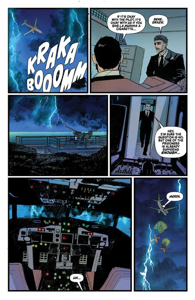 Second, there’s a scene where the sequence of events doesn’t make sense. In the opening act, the FBI plane containing Don Antonio, Giulietta Romeo, and Ferdinand is shot down by an anti-aircraft gun. After reading through the sequence multiple times, it’s unclear how anyone escaped the plane.