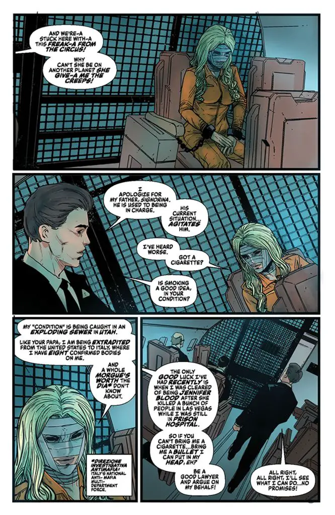 Last but not least, the issue ends with a surprise reveal about Giulietta that strains credibility, and the resolution is too fast and too easy. You could make the case that the mondo, cult nature of the story allows for wacky resolutions, so whether or not the ending is a down point is up to you.