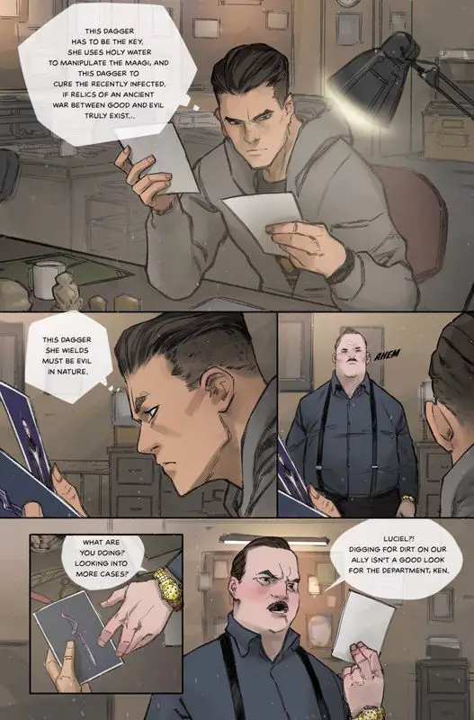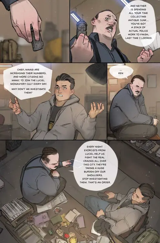 In issue number four, we jump forward in time to a world where people are becoming possessed by demonic energy, turning into a ravenous undead horde called the Magi. Khalida, now the holy mother in charge of the Luciel cult, is able to cure them. Meanwhile, Brenna, now grown up and an assassin, forms an alliance with Detective Ken, who suspects something suspicious about Khalida’s powers. Detective Ken refuses to stop investigating, leading him to quit his job.