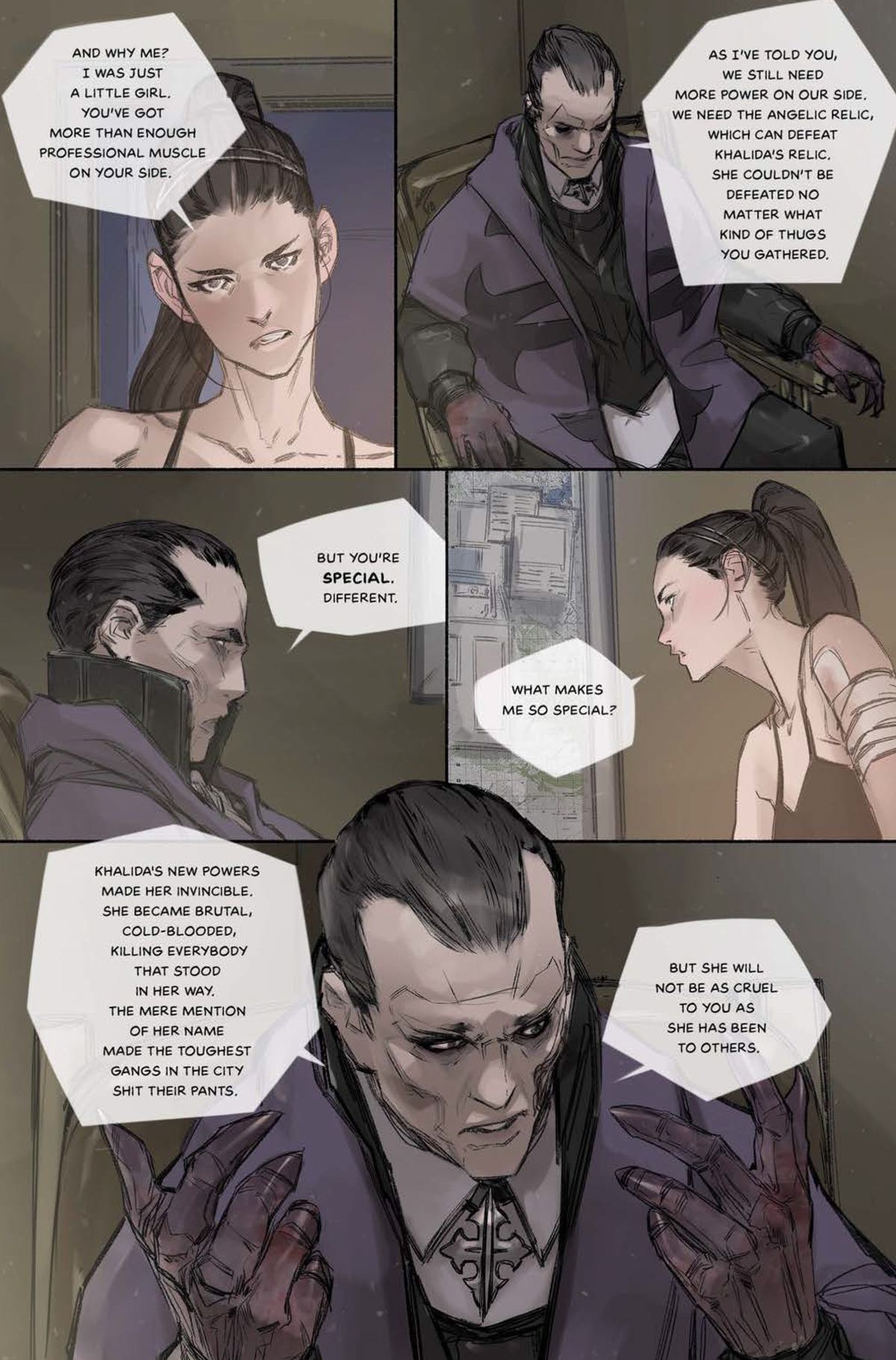 Khalida agrees to Ken’s offer. Ken recounts the reality of an ancient war between Heaven and Hell. At the end of the war, the forces of good and evil each placed their power in a relic and hid them away to maintain peace. Khalida has the evil relic, and the good relic passed down through generations in one family – Brenna’s.