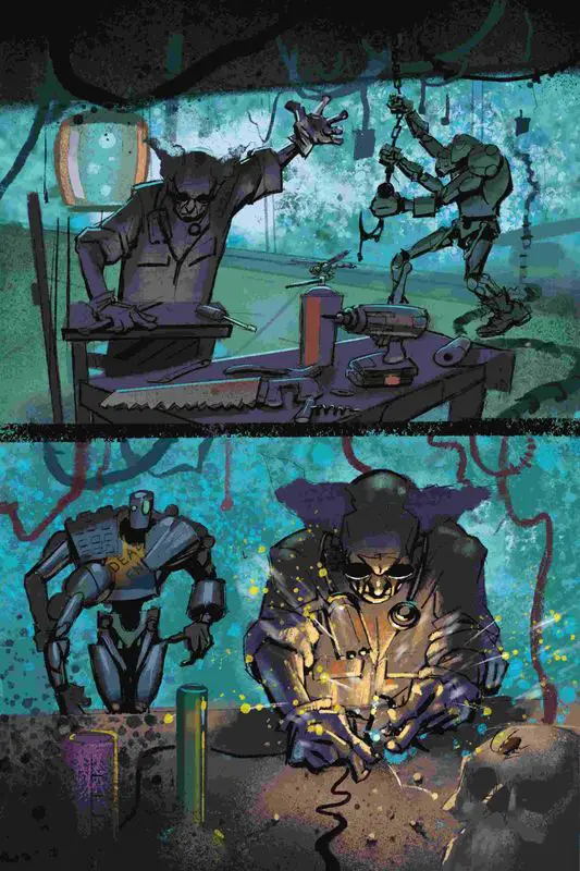 “In HUMBABA #2, we enter where the robot takes Gil’s body into this strange underground laboratory with this strange underground set of apparatuses and equipment. And there’s a mad scientist character there, and they put Gil back together and bring him back to life Frankenstein style.”