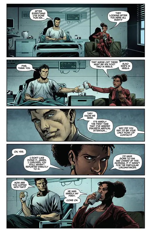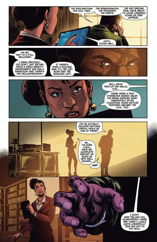 The first half of the comic feels disjointed, with important events happening off-panel and confusing character interactions. Bond’s swift return to Earth after the space station incident lacks proper explanation, and certain plot points, like Miss Moneypenny’s grenade incident, are brushed aside too casually.