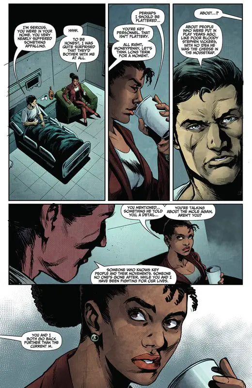 In issue #4, Bond returns to Earth recovering from the aftermath of his space station ordeal. He teams up with Miss Moneypenny, and together they deduce that the current M might be involved in the Stalvoda Project. They devise a plan to confront M and unravel the truth behind the conspiracy. Meanwhile, operatives observe M’s actions, leading to a tense confrontation that ultimately reveals Russia’s involvement in the long-standing scheme.