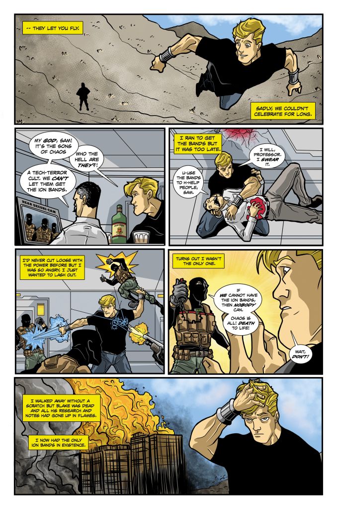 Soon, Sam finds himself naturally drawn into the role of a superhero. He fights crimes and disasters on increasingly larger scales until his reputation spreads worldwide. Sam finds himself increasingly comfortable with the superhero life when, one day, his bands notify him that the power source is running out. Without the technical know-how or the plans, Sam grows increasingly fearful of losing his powers, so he begins to ration their usage to make them last as long as possible.