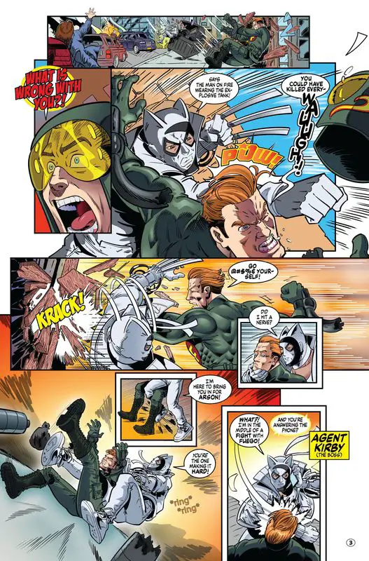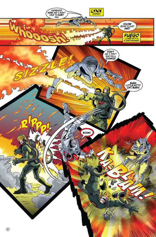 Lynx #4 begins with a brief prologue showing Mateo using his superior fighting skills to take down a flamethrowing arsonist called Fuego (that’s Fire in Spanish). After brief yet impressive acrobatics and hand-to-hand combat, Mateo knocks Fuego out. Just as the fight ends, Mateo receives a call from Agent Kirby of the FBI requesting a meeting.