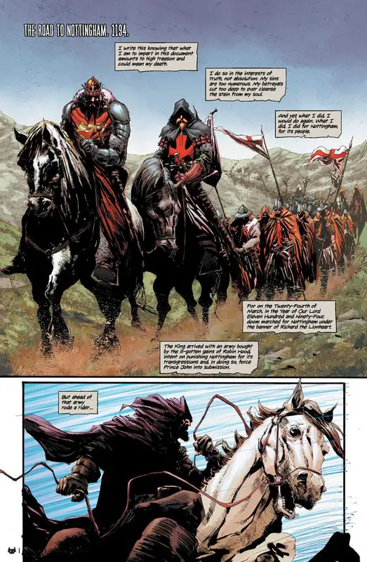 In the previous issue, Sheriff Blackthorne and Robin of Loxley formed an uneasy alliance to save King Richard from his kidnappers. They traveled through various countries but parted ways eventually. Blackthorne now returns to Nottingham to find Marion orchestrating a takeover, using Little John as a front. He realizes they must unite against King Richard’s imminent arrival.