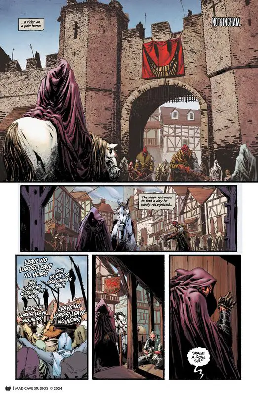 NOTTINGHAM #11, by Mad Cave Studios on 4/10/24, brings Sheriff Blackthorne secretly back to Nottingham ahead of King Richard’s invading army. Can he convince Marian to form an alliance before it’s too late?