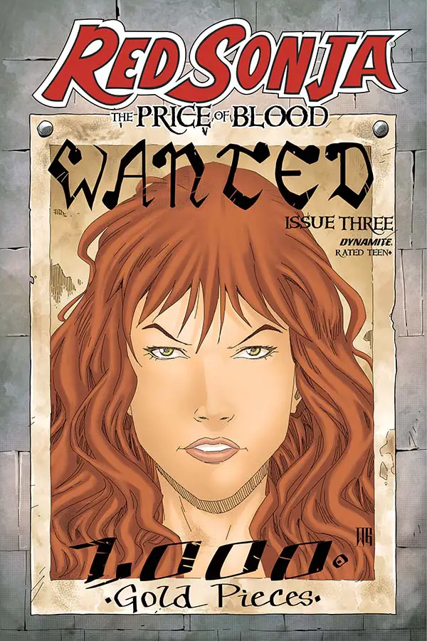 In this exclusive preview of RED SONJA: THE PRICE OF BLOOD #3, available from Dynamite comics on February 17th, 2021, Red Sonja takes a job to kill the corrupt leaders of a rival town and collect her bounty under the noses of a massive army and townspeople that hate her.
