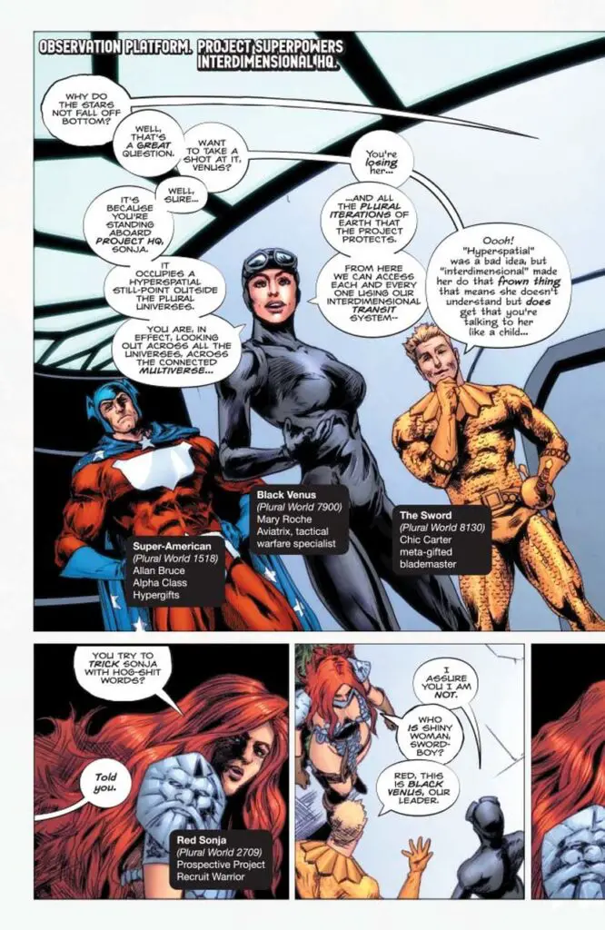 In this exclusive preview of RED SONJA: THE SUPERPOWERS #4, available from Dynamite Comics on April 14th, 2021, Red Sonja struggles with language barriers, cultural differences, and a bunch of science-based heroes who don’t believe in magic.