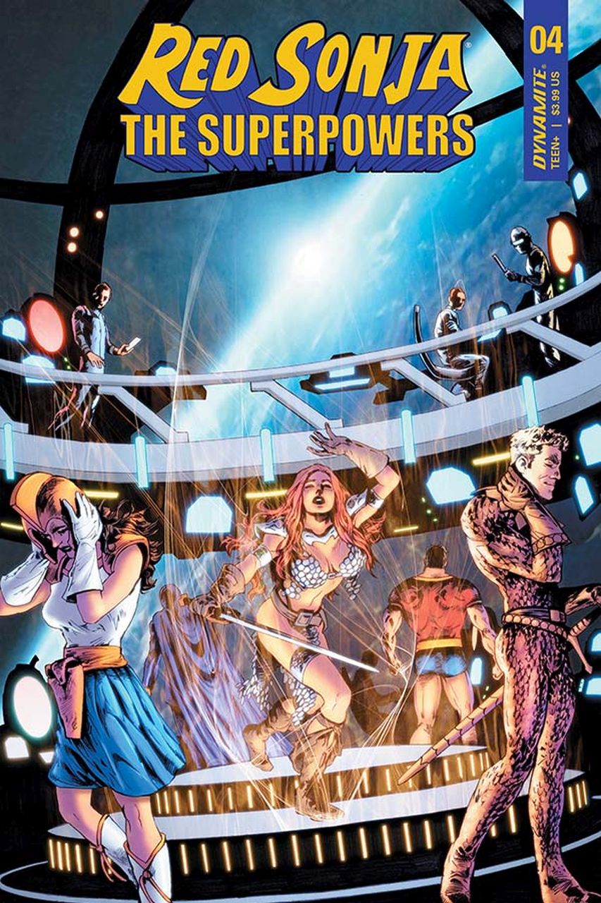 In this exclusive preview of RED SONJA: THE SUPERPOWERS #4, available from Dynamite Comics on April 14th, 2021, Red Sonja struggles with language barriers, cultural differences, and a bunch of science-based heroes who don’t believe in magic.