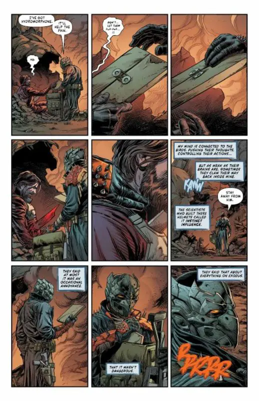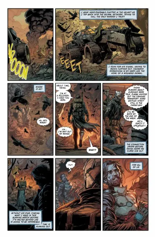 Rook: Exodus #1 is the third of three brand new number ones from Ghost Machine, the new creator-owned imprint headed up by Geoff Johns and other well-known creators. Set in the year 2173, people flee Earth due to ecological disasters, seeking refuge on a new planet called Exodus. Wardens are equipped with helmets that control specific animal species, aiding in terraforming and population control. However, when the world engine, the central AI, fails, chaos ensues. Rook, the main character, scavenges for survival, aiming to escape the dying planet.