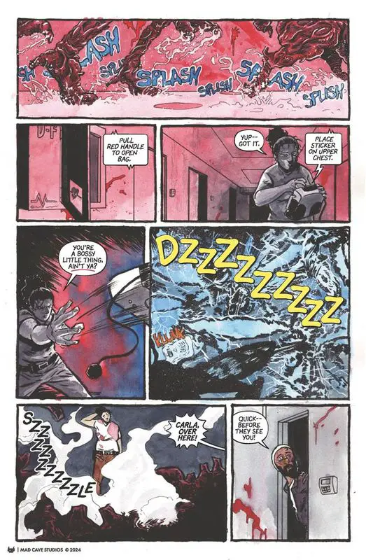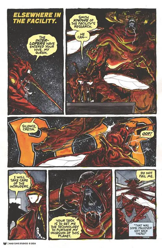 In the previous issue, we witnessed the quaint town’s Summer Festival being overrun by alien mosquito-like creatures. These pesky bugs transform anyone they bite into mutant aliens, setting the stage for an impending invasion. Our ragtag group of heroes, including Luis, Carla, JJ, and Agent Smith, fought valiantly against the swarm but soon discovered a more significant threat—the emergence of a sentient queen ready to conquer the world.