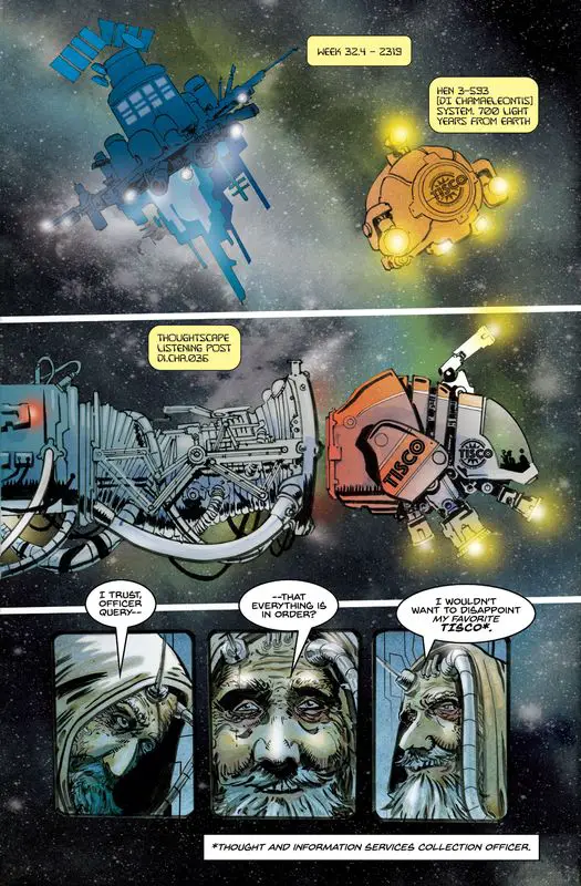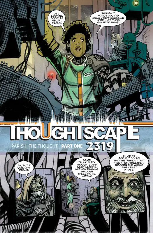 Officer Parish Query patrols the outer reaches of known space to protect the interests of the LifeTech corporation. The ThoughtScape is a plane of reality where thoughts can be harvested for a myriad of uses, including product development and researching the existence of God. On one of her patrols, Officer Query encounters a space church whose worshippers were attacked by someone or something.