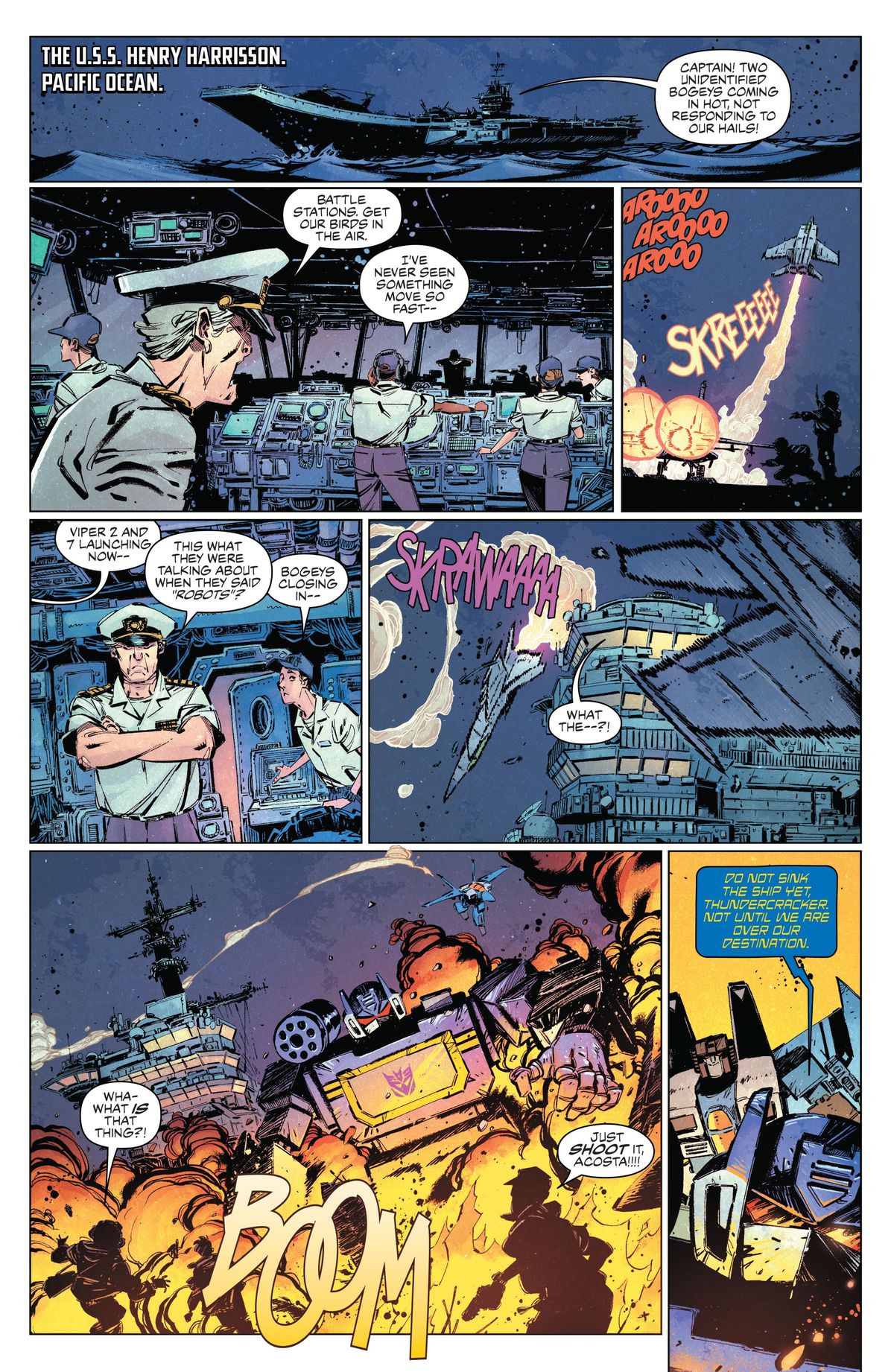 In TRANSFORMERS #8, Soundwave leads the Decepticons on a raid to capture and scuttle an American battleship. The goal? Sink the ship near the crash site of the Decepticon ship, Nemesis, and use the battleship’s nuclear core as a steady supply of energy to make Energon and revive their fallen comrades.
