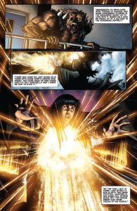 Vampirella: Armageddon #2 opens with Vampirella’s werewolf partner recounting the events that led to her disappearance. He explains to a group of skeptical individuals how Vampirella was blasted into a portal during a fight with a demon high priest, who was performing a ritual with missing immigrants. The werewolf claims he was knocked out by the blast and the priest escaped, leaving Vampirella trapped in another dimension. The group questions his involvement and loyalty, noting that he hasn’t been in touch with Vampirella for weeks, despite being her supposed partner.