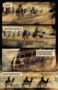 The framing device of Vampirella’s partner recounting events feels a bit clunky and takes away from the immediate impact of Vampirella’s new predicament. The dialogue of the nomadic tribesmen, while functional, occasionally leans into generic villainous tropes. The swiftness with which Vampirella dispatches the tribal leader, while satisfying, resolves the immediate threat almost too quickly, potentially undermining the perceived danger of her surroundings.