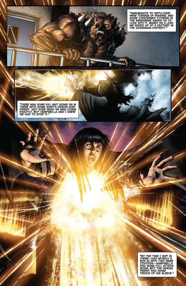 In Vampirella: Armageddon #1, Vampirella and her werewolf partner investigated the disappearances of immigrants in Sepulcher City, specifically in the Ackerman District’s factory. They confronted a demon high priest conducting a ritual. During the fight, Vampirella was blasted by a magical attack and sent flying into a conjured portal, which then exploded and closed, leaving her partner knocked out and the priest escaped.