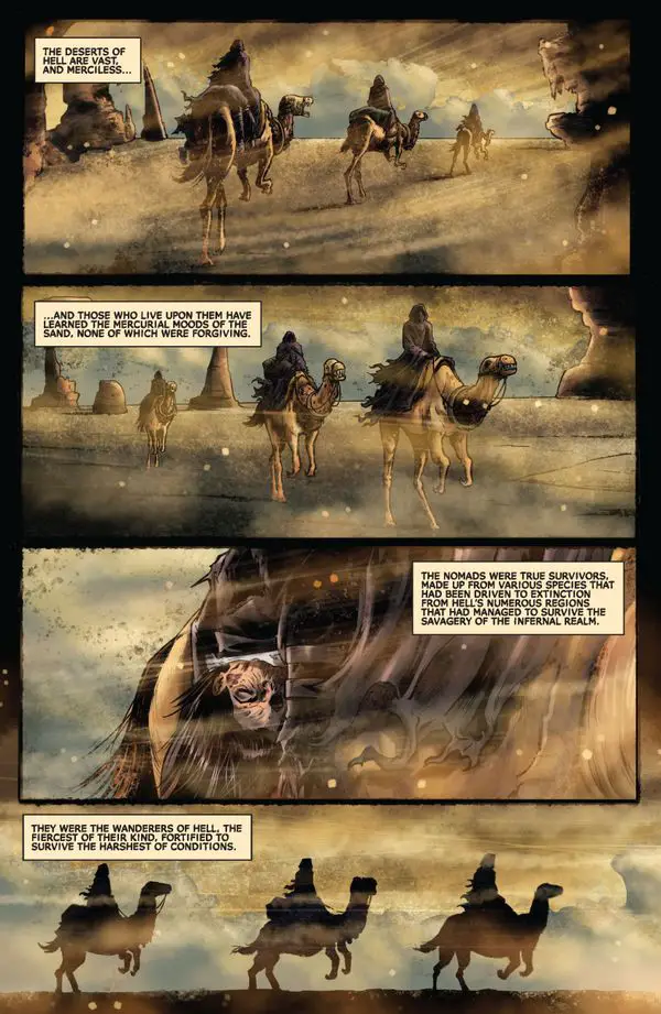 Meanwhile, Vampirella awakens in the vast and merciless deserts of Hell. She is disoriented and injured, her skin being scoured by a sandstorm. She is discovered by a tribe of nomads, described as fierce survivors from various species driven to extinction in Hell. These nomads wander the desert, living off what the harsh environment provides.