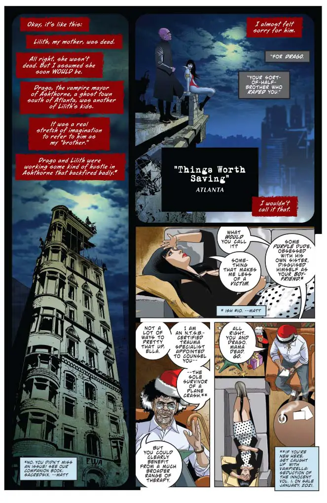 Vampirella is about to test that old saying – “You can’t go home again.” In Dynamite Comics’ exclusive preview of VAMPIRELLA (Vol. 5) #16, available from retailers on December 3th, 2020, the alien vampire warrior gets some much-needed therapy to figure out what to do with her life now that her mother, Lilith, is dead. The answer is not quite so simple.