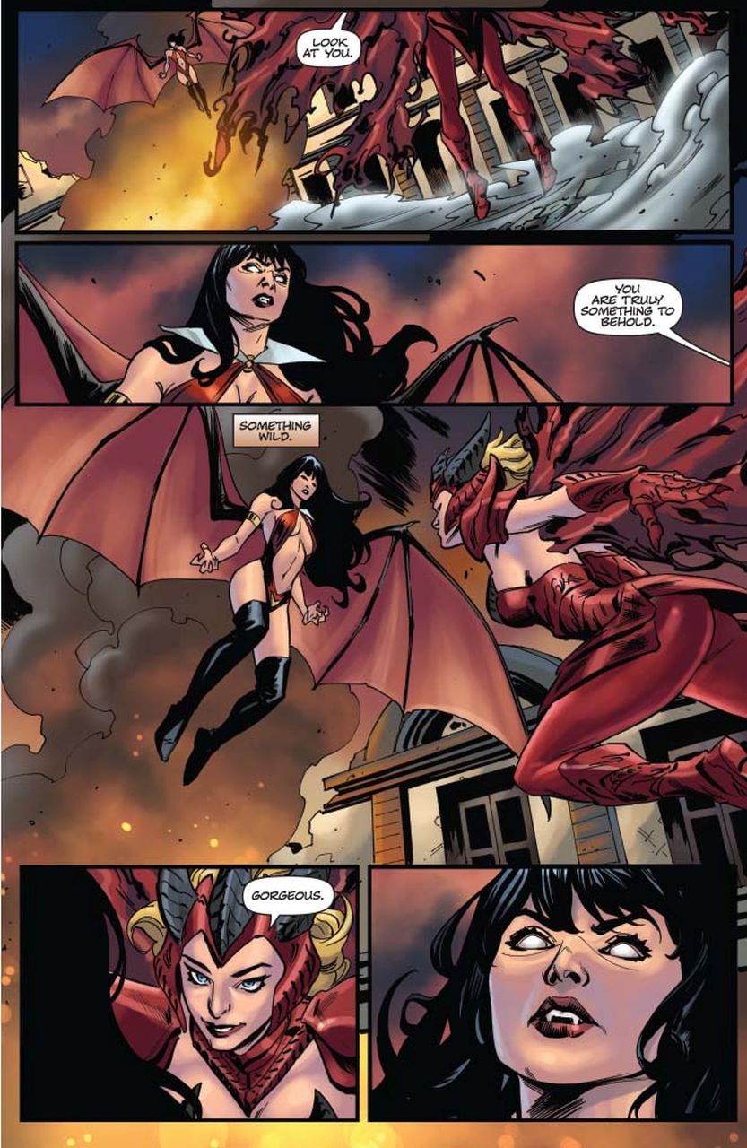 In this exclusive preview of VENGEANCE OF VAMPIRELLA #19, available from Dynamite Comics on June 23rd, 2021, Vampirella powers up with Abaddon’s blood against Nyx in her Hemorrhage armor to settle their conflict once and for all.