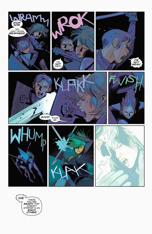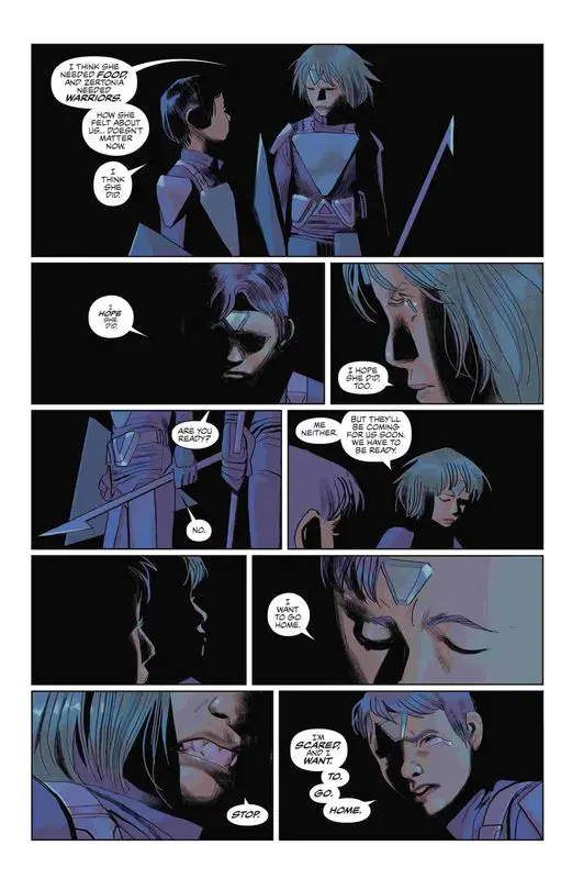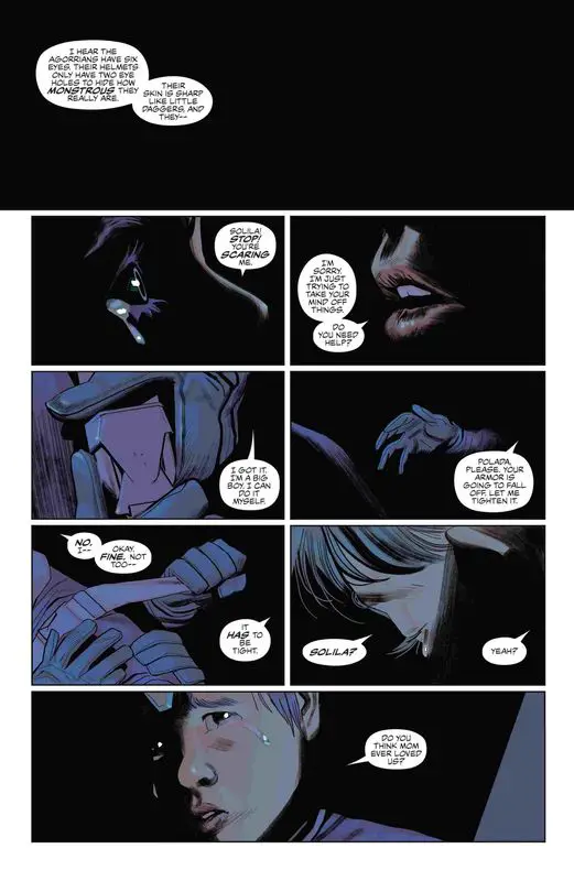 Now, we get into Void Rivals #8 with a flashback to Solila when she was a young girl, forced to train to become killers and warriors with her brother, Polada. In the present, Darak and Solila are pursued by Proximus on a motorcycle in the wastelands. After days of walking, they are attacked by Proximus, leading to a big fight. Despite Proximus’s impenetrable cyborg body, they manage to escape, but not without serious injuries.