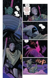 When last we left the unlikely allies in issue #8, Darak and Solila continued their long trek through the wastelands when Proximus ambushed them with lethal intent. Darak used Handroid to set off a last-resort explosion that sent Proximus and Solila flying. Unfortunately, Solila landed on Proximus’s spear.